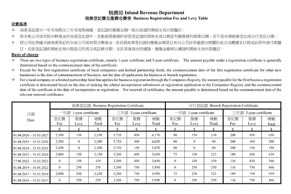 根据税务局公布的收费表,在 2026年4月1日至2027年3月31日 期间开始生效的商业登记证,应缴费用如下:
