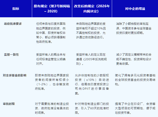 2026年3月,印度政府宣布对第3号新闻稿框架下的某些规定进行澄清和放宽,旨在平衡国家安全考虑与促进外国投资的需求。主要变化概述如下。
